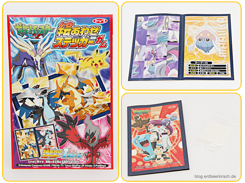Die kleine Packung (von Lotte) mit fünf Kaubonbons hat ebenfalls unterschiedliche Motive, jedoch immer Ananasgeschmack. Jedes Bonbon ist mit einem Pokémonpapier umwickelt, wovon eines von fünf einen Sticker beinhaltet. Die Kaubonbons sind leider recht hart und werden erst beim Kauen weicher. Dafür haben sie ein gutes Fruchtaroma.